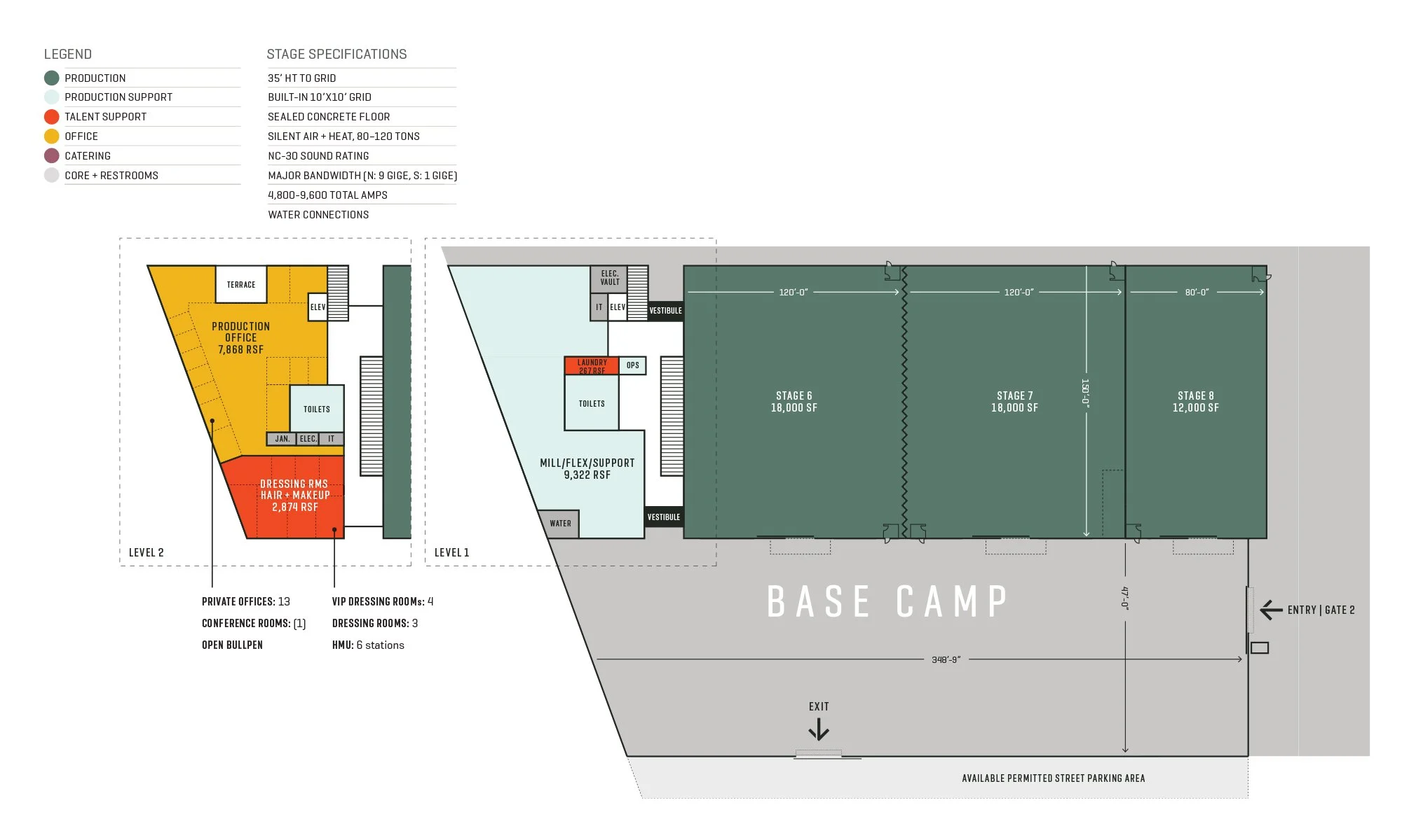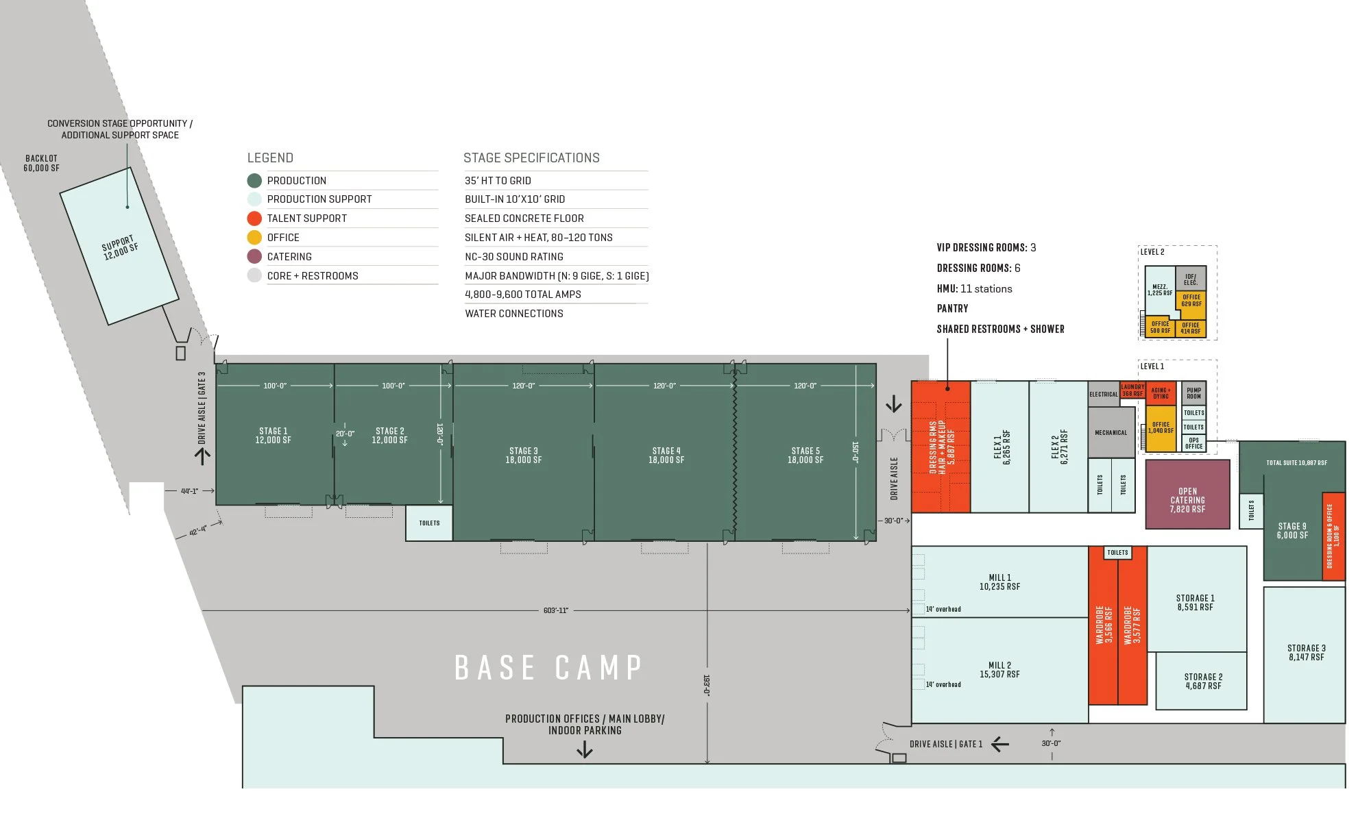 Located on a 1.5-acre backlot at the northwest corner of the The Fields Studios campus, this 12,000 SF stand-alone annex warehouse offers flexible space for fabrication, storage, staging, and production support. Featuring 27’ clear height, two large overhead doors, and a truck dock for easy loading and access, the building is ideal for handling large equipment, materials, and production logistics.