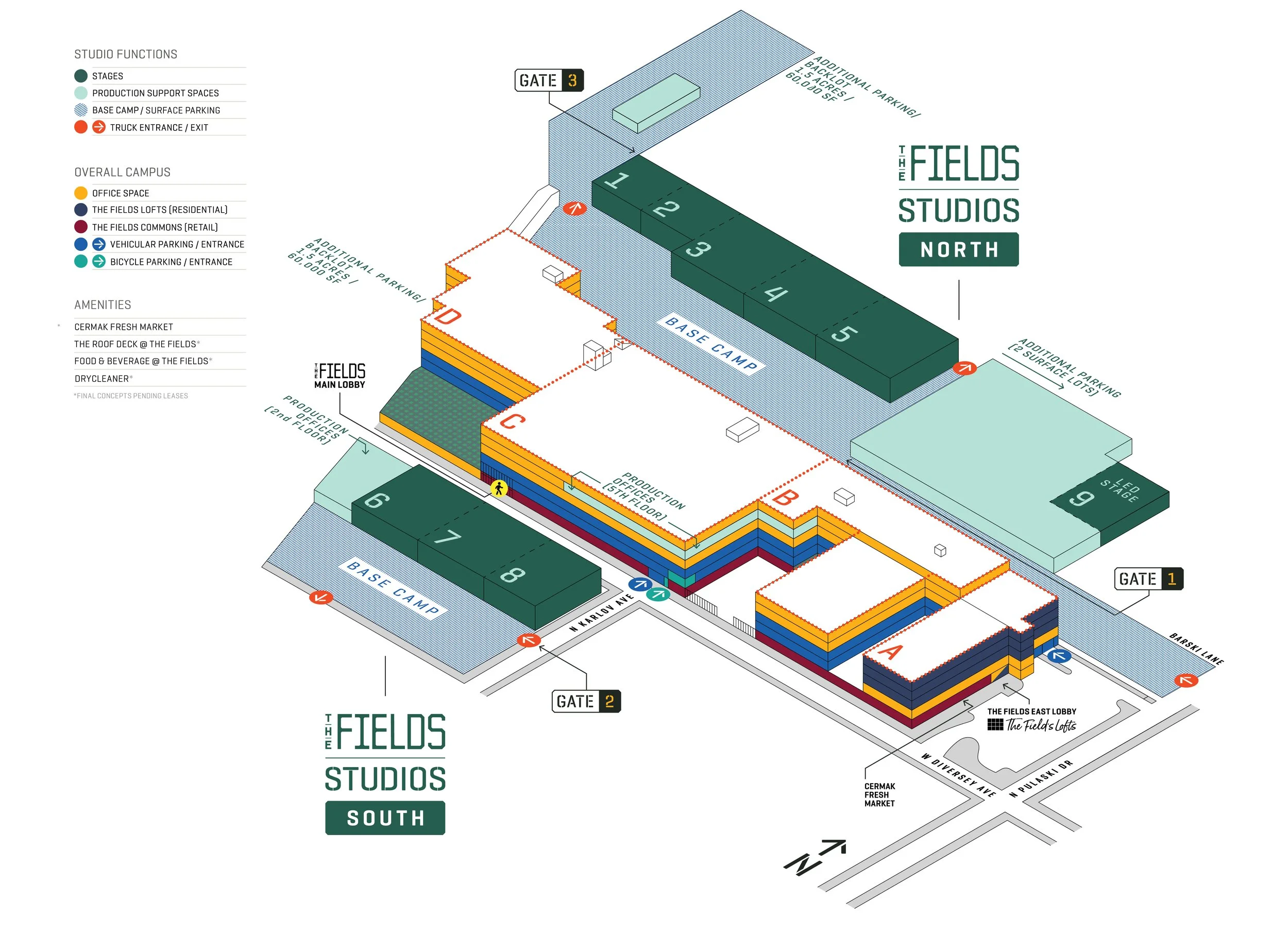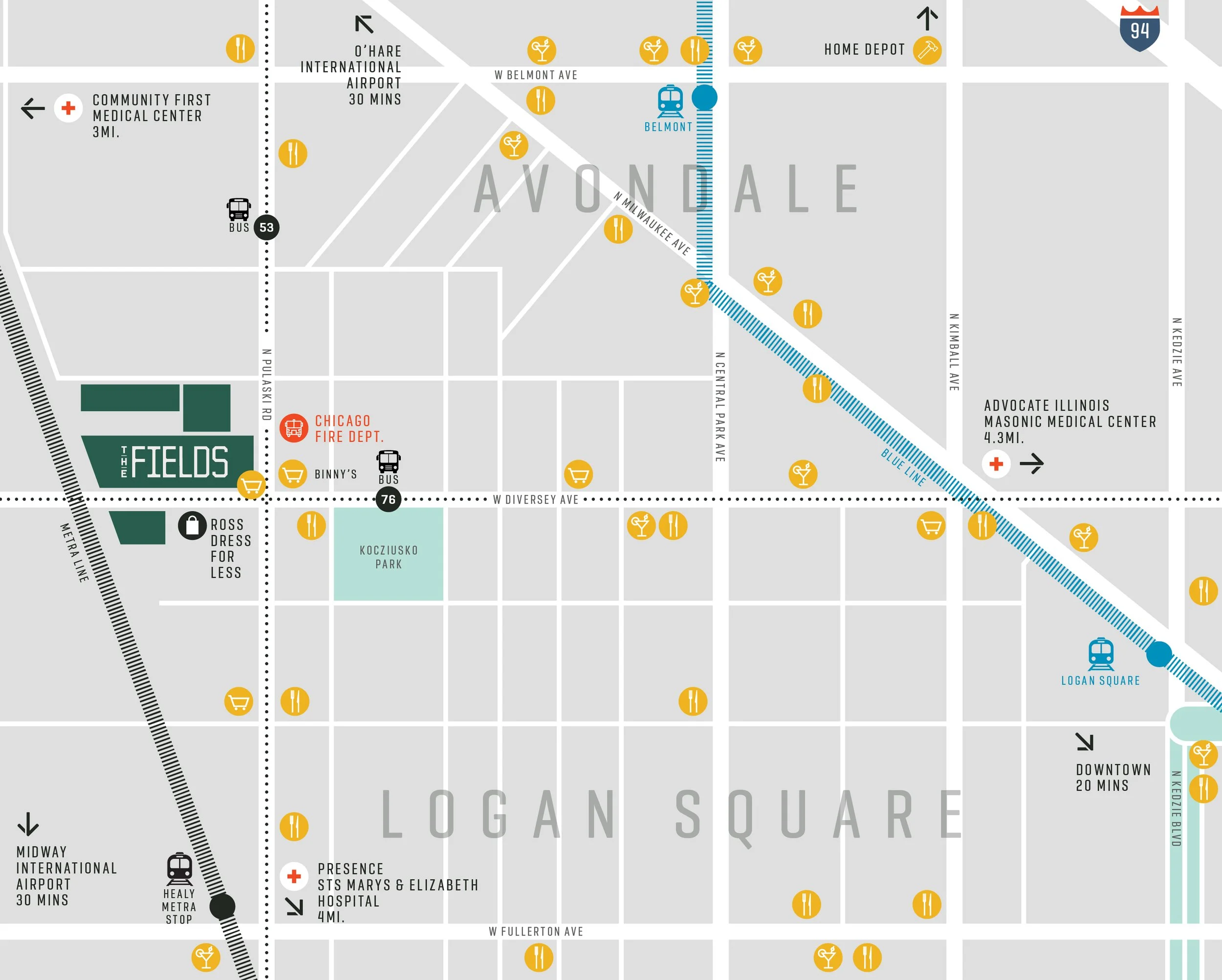 Located at the intersection of Logan Square, Avondale, and Hermosa, The Fields Studios is embedded in one of Chicago’s most creative and culturally dynamic districts. Within a two-mile radius, the surrounding area is home to 12 Michelin-starred restaurants, reflecting the neighborhood’s nationally recognized dining scene. More than a dozen public parks and trails are located within close proximity of The Fields Studios, offering rare access to green space alongside an active urban environment. Anchored by strong transit connections, nearby hospitals, established lumber yards, light-industrial services, and neighborhood retail corridors, the campus benefits from a unique balance of creative culture, production-ready infrastructure, and everyday amenities.